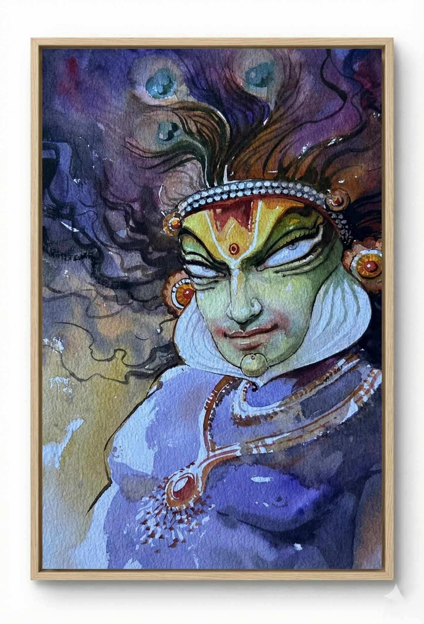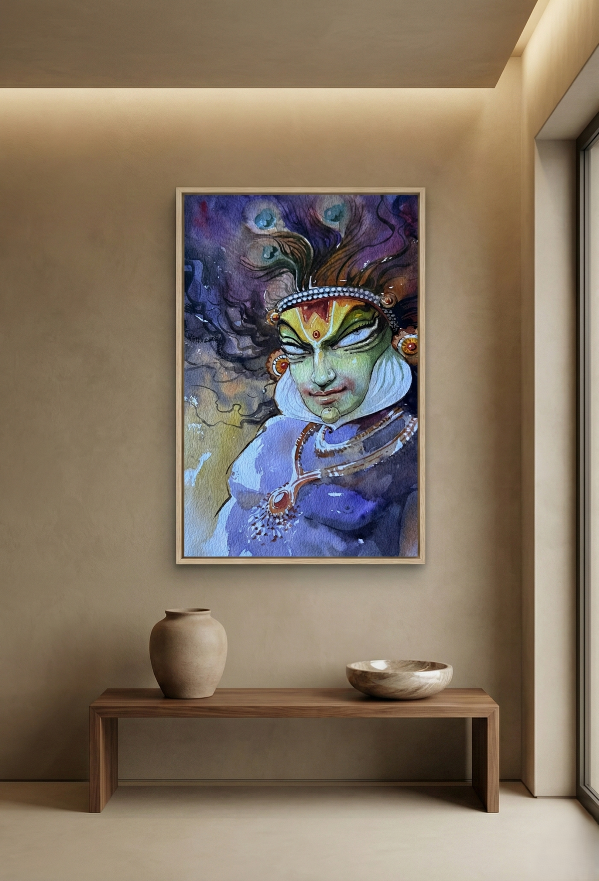 A moment of stillness, held in watercolor. This piece reflects Krishna not in motion, but in presence — divinity expressed through form, color, and quiet intensity. Its restrained textures and balanced composition create a reverent, inward presence, designed to bring meaning and subtle power into thoughtful interiors.